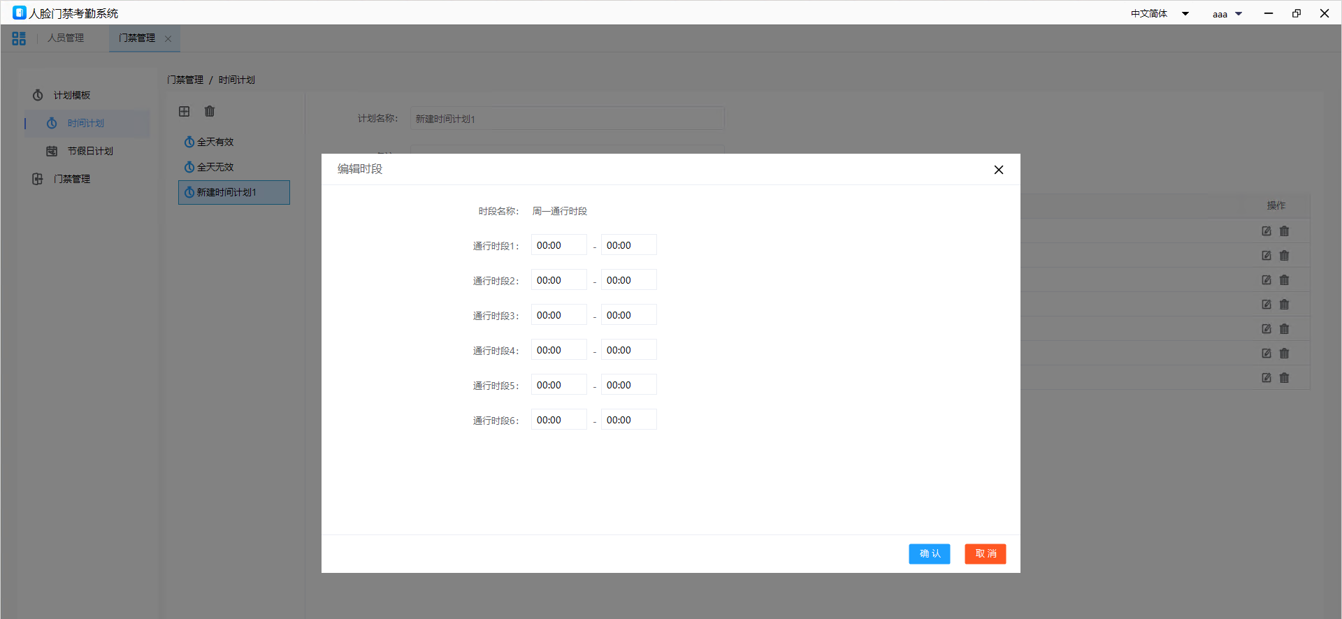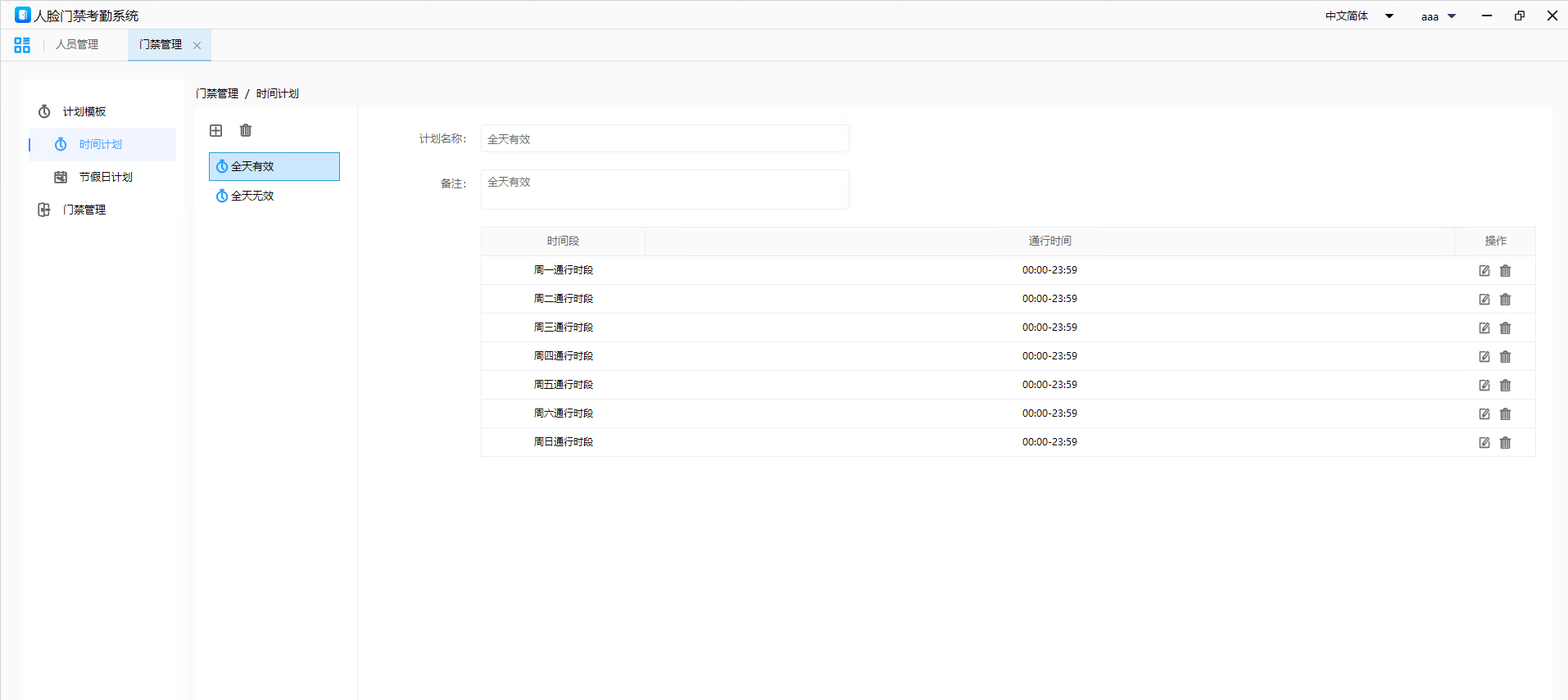 表示全天不可通行,系统有默认2个时间计划,1个为全天有效,1个为全天无效,并且默认的不可编辑和删除。多模板管理:支持创建多个计划模板,可根据人员分组或场景灵活分配。
