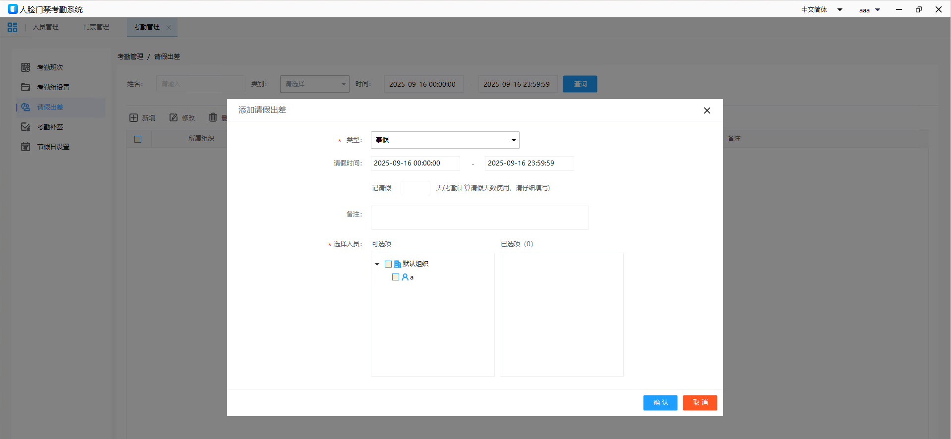 本功能用于管理员工的请假和出差记录,支持新增、编辑、删除请假/出差申请,并可配置请假类别(如事假、病假、出差)。通过该功能,管理员可高效记录和查询员工的缺勤情况,确保考勤数据的完整性。