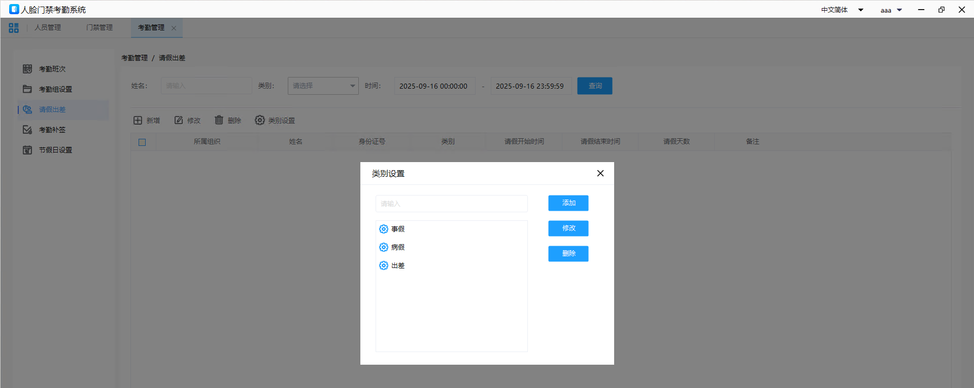 - 添加新类别:在输入框中填写新的请假/出差类别名称(如“年假”“婚假”),点击 “添加” 按钮保存。