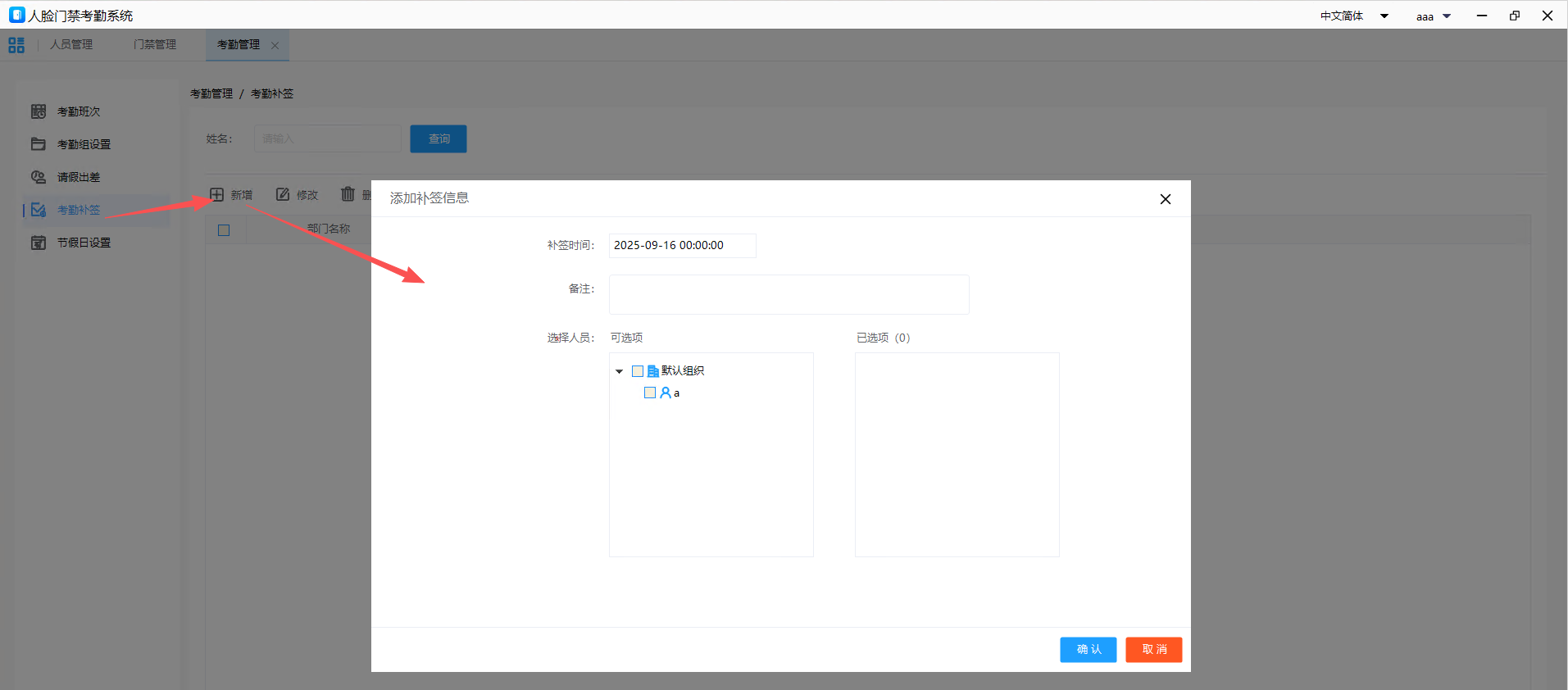 本功能用于管理员为员工补录因故未正常记录的考勤信息,适用于员工忘记打卡、设备故障等特殊情况。
