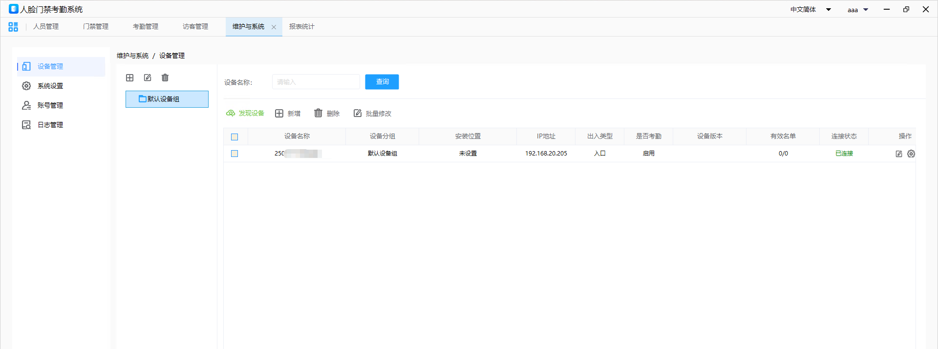 本功能用于管理企业内的门禁、考勤等设备信息,支持设备的新增、查询、批量编辑、删除及发现新设备,同时可关联设备与分组、配置设备基础参数(如IP地址、出入类型等),实现对设备资源的集中化管控。