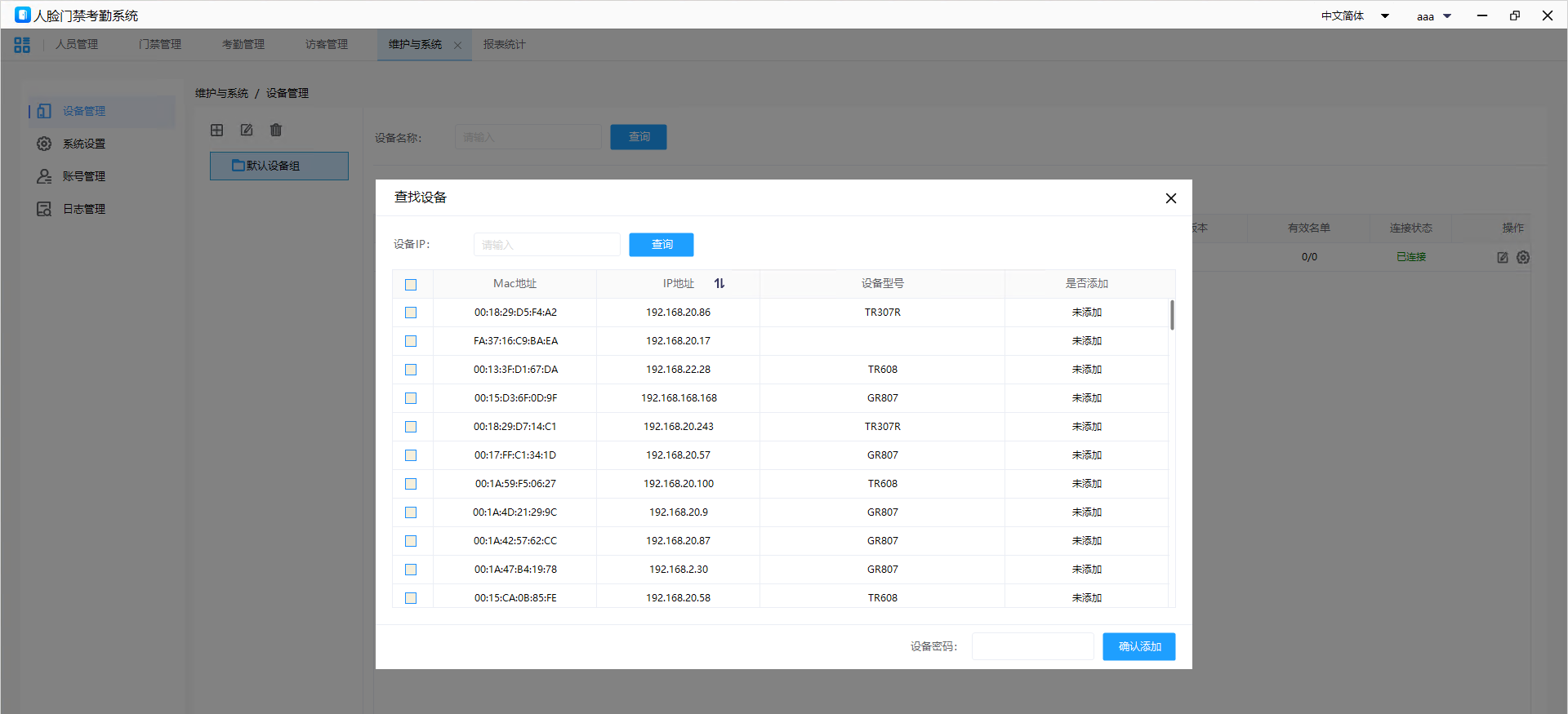 - 在设备列表中勾选需添加的设备,输入“设备密码”后,点击蓝色“确认添加”按钮完成添加。