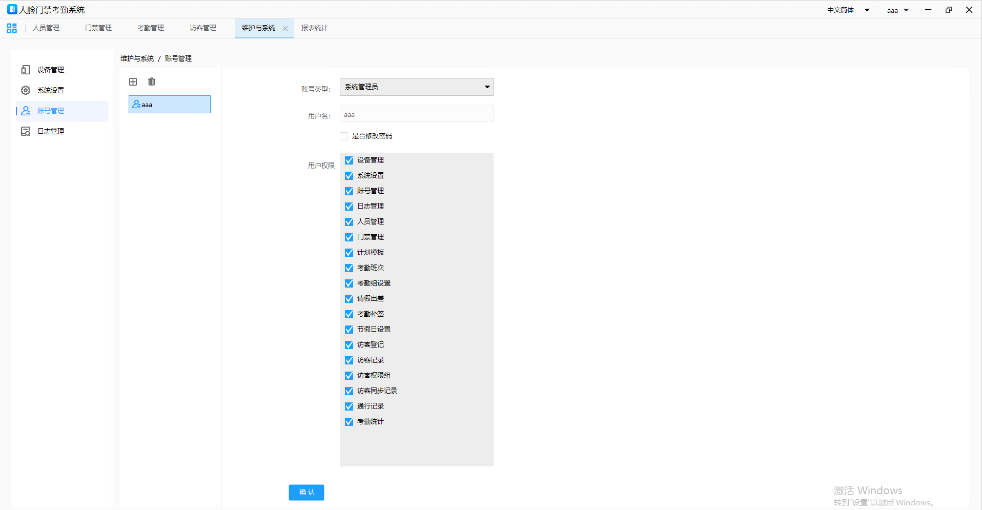用户可以根据实际需求勾选或取消勾选相应的权限,以分配给该账号特定的操作权限。