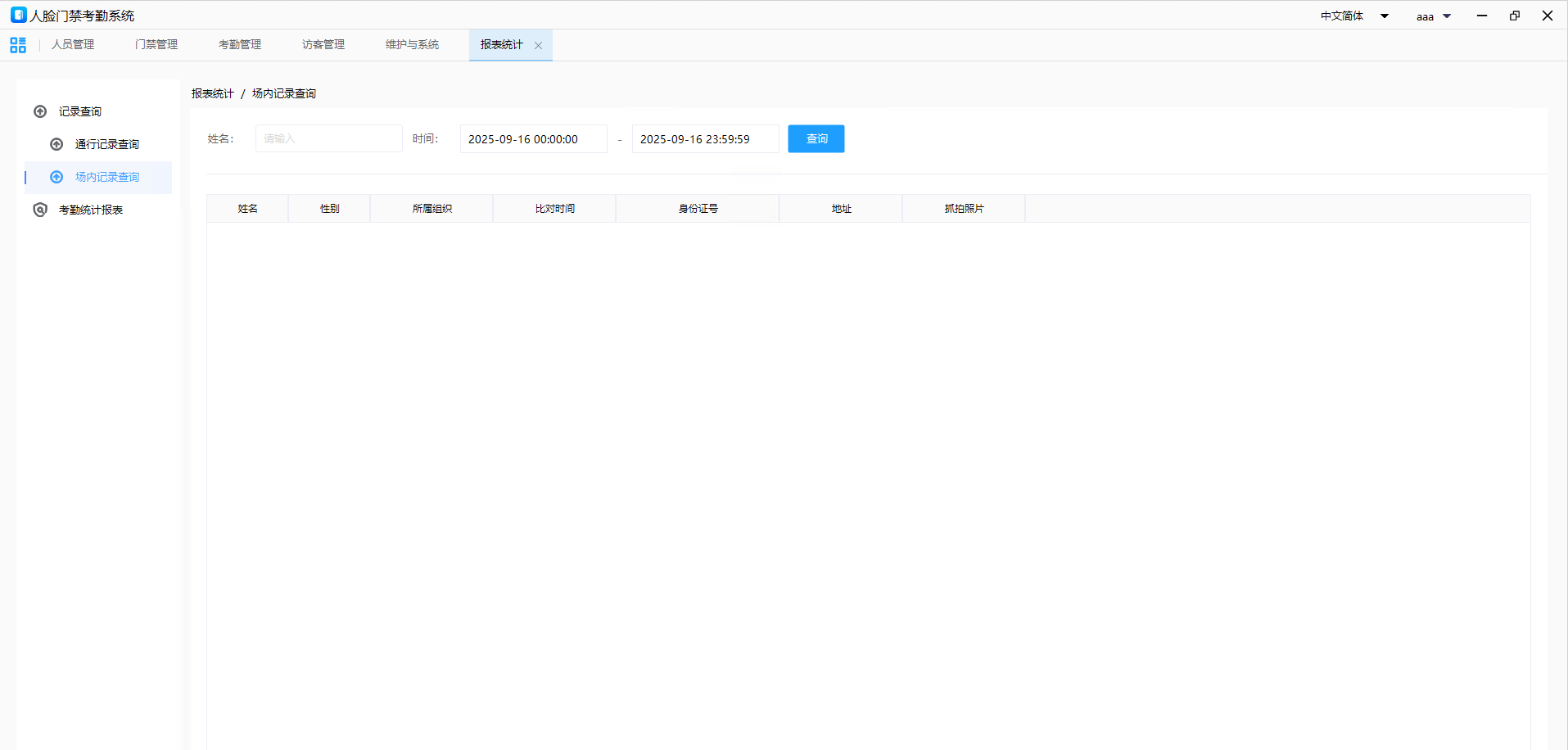 本模块为“报表统计 / 场内记录查询”模块,主要用于查询特定时间段内的场内人员相关记录信息。可查询的字段包括姓名、性别、所属组织、比对时间、身份证号、地址以及抓拍照片等内容,方便用户对场内人员的活动情况进行统计和追溯。