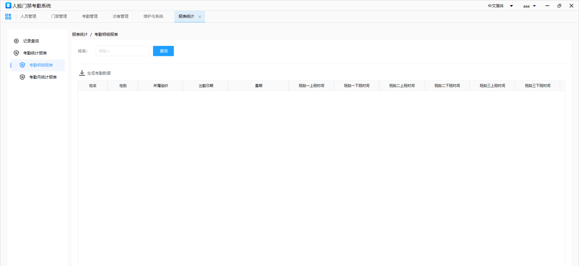 - 登录系统后,看到处于主页左侧最下方的 “报表统计”后 →点击 “考勤统计” →点击 “考勤明细报表”,进入考勤明细报表页面。