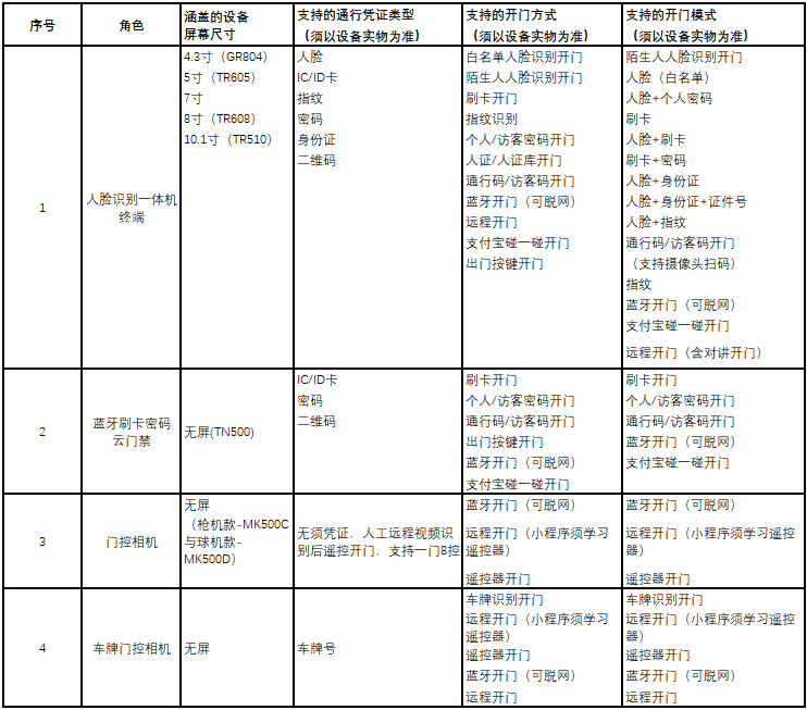 管理员可以通过设备管理页面右下角“+”按钮进入登记设备页面,进行扫码添加设备和手动录入设备;也可通过微信“扫一扫”功能扫描设备开机页面的二维码进行添加设备。设备支持添加的设备类型、设备支持的开门方式、鉴权模式说明如下: