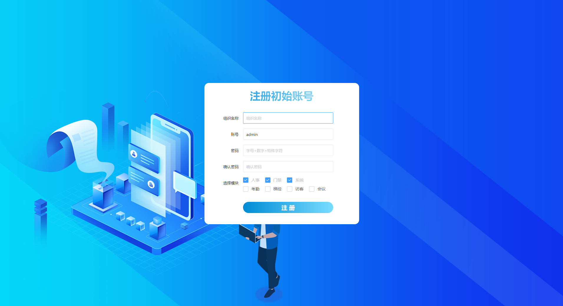 | 选择模块 | 选择不同的模块,系统会展示出对应模块的功能,其中人事、门禁、系统3个模块默认为必选项 |