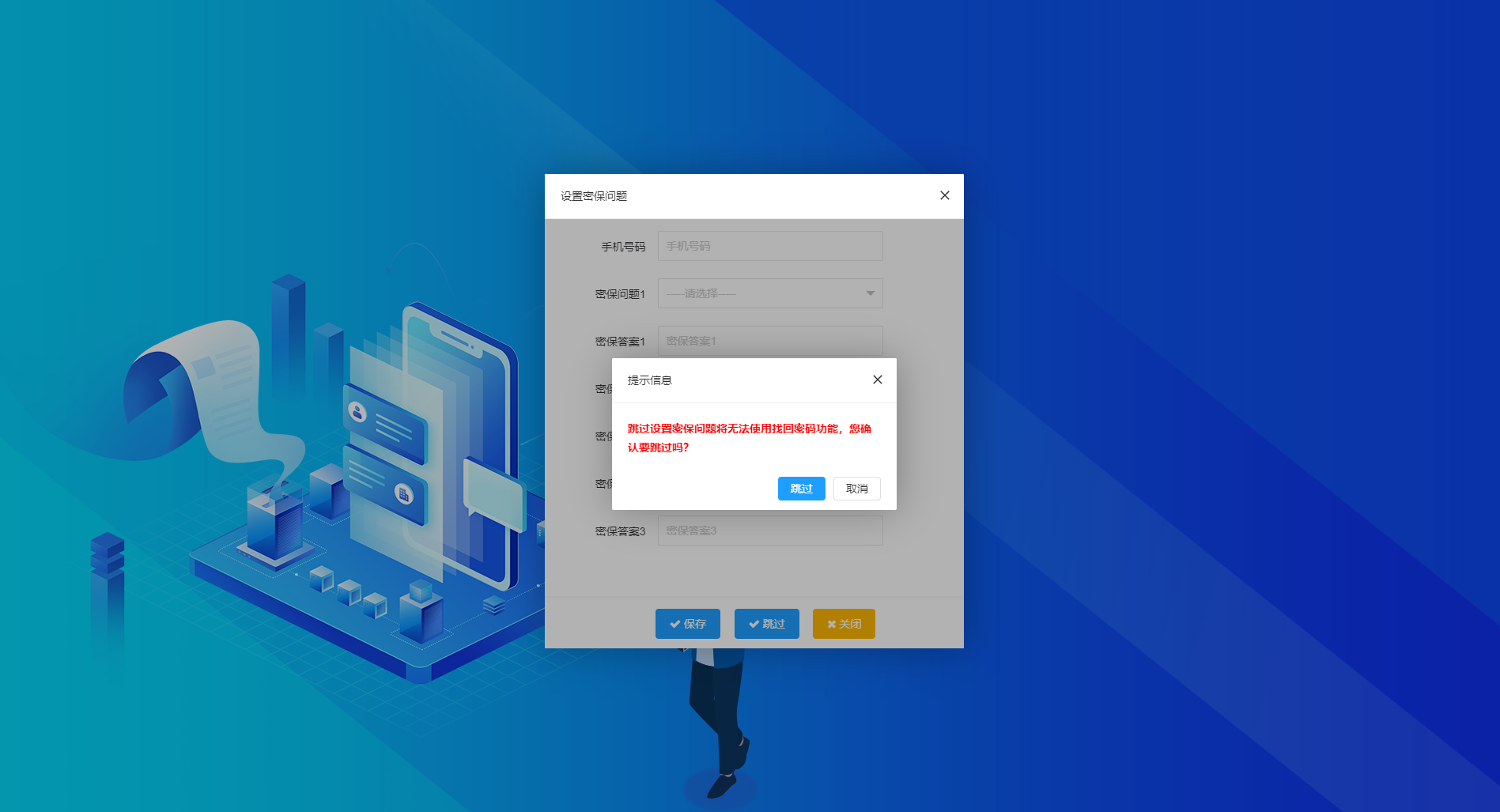 当点击【跳过】按钮时,即可跳过设置密保问题这一步骤,后续也将无法通过【找回密码】功能自行找回初始账号的密码