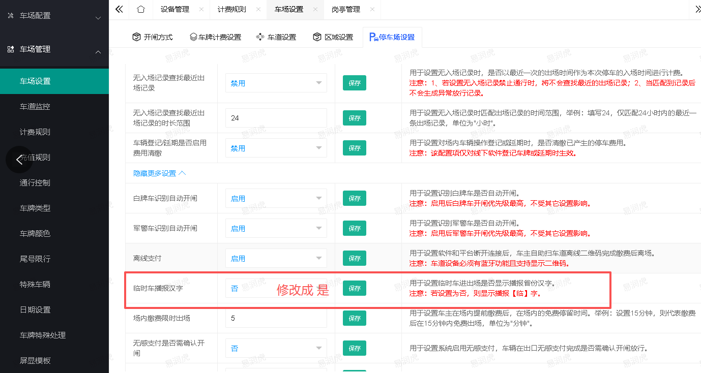4.在软件后台的【车场管理】——【车场设置】——【停车场设置】——【临时车播报汉字】设置成【是】