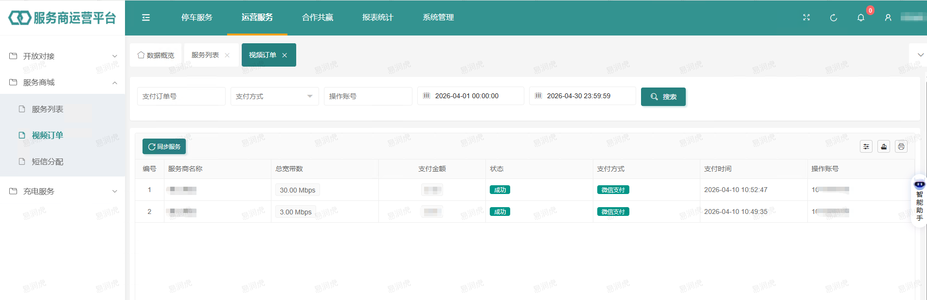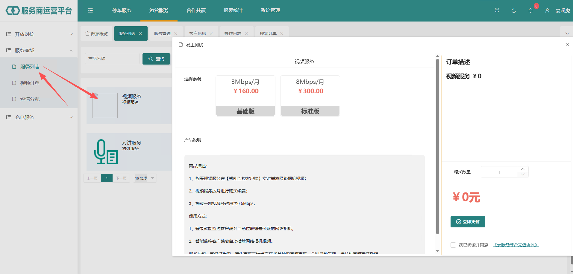 第二步:在运营服务–服务商城,服务列表处,选择视频服务,并选择对应套餐进行购买