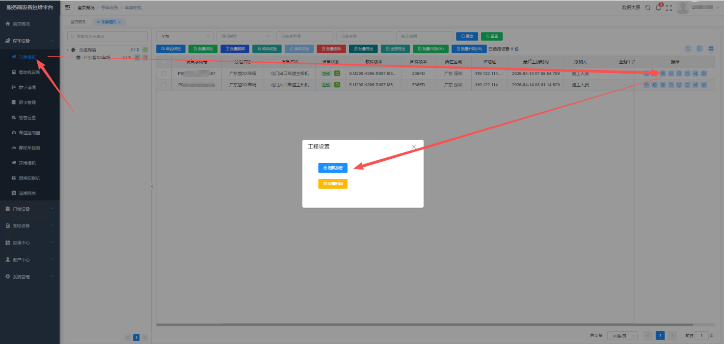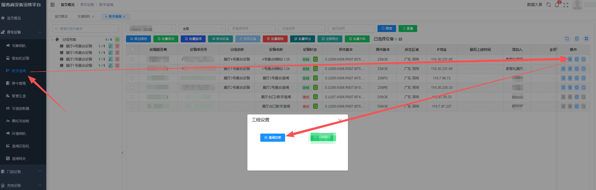目录 搜索 展开 物联网平台操作说明一、用户登录二、首页概况三、停车设备3.1、车牌相机3.1.1、单台绑定3.1.2、批量绑定3.1.3、批量解绑3.1.4、移动设备3.1.5、修改设备3.1.6、批量删除3.1.7、批量导出3.1.8、全部导出3.1.9、设备操作3.2、智助机设备3.2.1、单台绑定3.2.2、批量绑定3.2.3、批量解绑3.2.4、移动设备3.2.5、修改设备3.2.6、批量删除3.2.7、批量导出3.2.8、全部导出3.2.9、设备操作3.3、智管云盒3.3.1、单台绑定3.3.2、批量绑定3.3.3、批量解绑3.3.4、移动设备3.3.5、修改设备3.3.6、批量删除3.3.7、批量导出3.3.8、全部导出3.3.9、设备操作3.4、数字道闸3.4.1、单台绑定3.4.2、批量绑定3.4.3、批量解绑3.4.4、移动设备3.4.5、修改设备3.4.6、批量删除3.4.7、批量导出3.4.8、全部导出3.4.9、设备操作3.5、屏卡管理3.5.1、单台绑定3.5.2、批量绑定3.5.3、批量解绑3.5.4、移动设备3.5.5、修改设备3.5.6、批量删除3.5.7、批量导出3.5.8、全部导出3.5.9、设备操作3.6、车道控制器3.6.1、单台绑定3.6.2、批量绑定3.6.3、批量解绑3.6.4、移动设备3.6.5、修改设备3.6.6、批量删除3.6.7、批量导出3.6.8、全部导出3.6.9、设备操作3.7、摩托车控制3.7.1、单台绑定3.7.2、批量绑定3.7.3、批量解绑3.7.4、移动设备3.7.5、修改设备3.7.6、批量删除3.7.7、批量导出3.7.8、全部导出3.7.9、设备操作3.8、对讲立柱3.8.1、单台绑定3.8.2、批量绑定3.8.3、批量解绑3.8.4、移动设备3.8.5、修改设备3.8.6、批量删除3.8.7、批量导出3.8.8、全部导出3.8.9、设备操作四、门禁设备4.1、人脸门禁4.1.1、单台绑定4.1.2、批量绑定4.1.3、批量解绑4.1.4、移动设备4.1.5、修改设备4.1.6、批量删除4.1.7、批量导出4.1.8、全部导出4.1.9、设备操作4.2、二维码门禁4.2.1、单台绑定4.2.2、批量绑定4.2.3、批量解绑4.2.4、移动设备4.2.5、修改设备4.2.6、批量删除4.2.7、批量导出4.2.8、全部导出4.2.9、设备操作4.3、物业电话机4.3.1、单台绑定4.3.2、批量绑定4.3.3、批量解绑4.3.4、移动设备4.3.5、修改设备4.3.6、批量删除4.3.7、批量导出4.3.8、全部导出4.3.9、设备操作4.4、访客机4.4.1、单台绑定4.4.2、批量绑定4.4.3、批量解绑4.4.4、移动设备4.4.5、修改设备4.4.6、批量删除4.4.7、批量导出4.4.8、全部导出4.4.9、设备操作五、充电设备5.1、汽车充电桩5.1.1、单台绑定5.1.2、批量绑定5.1.3、批量解绑5.1.4、移动设备5.1.5、修改设备5.1.6、批量删除5.1.7、批量导出5.1.8、全部导出5.1.9、设备操作5.2、单车充电桩5.2.1、单台绑定5.2.2、批量绑定5.2.3、批量解绑5.2.4、移动设备5.2.5、修改设备5.2.6、批量删除5.2.7、批量导出5.2.8、全部导出5.2.9、设备操作六、账户中心6.1、客户管理6.1.1、新增6.1.2、批量启用6.1.3、批量禁用6.1.4、批量导出6.1.5、全部导出6.1.6、操作客户6.2、用户管理6.2.1、新增6.2.2、批量导出6.2.3、全部导出6.2.4、操作用户6.3、权限管理6.3.1、新增6.3.2、批量删除6.3.3、批量导出6.3.4、全部导出6.3.5、操作权限七、系统管理7.1、系统公告7.1.1、新增7.1.2、批量删除7.1.3、批量导出7.1.4、全部导出7.1.5、操作公告云盟调试助手小程序操作说明一、登录方式二、支持调试的设备及模式三、添加设备的方法四、各设备调试说明车牌相机蓝牙调试云端调试(网络调试)智助机蓝牙调试云端调试(网络调试)数字屏卡云端调试(网络调试)数字道闸云端调试(网络调试)五、常用设置说明小程序上对道闸、相机进行加密物联网平台常用设置说明如何实现数字道闸的平台调试平台上对相机和道闸进行加密物联网平台开放接口1、简介2、使用前提3、开发指引1、参数获取与设置2、签名认证3、签名代码示例4、接口列表远程访问设备网页智能监控客户端一、软件安装下载二、系统使用说明1、账号获取与登录2、软件布局介绍3、视频播放模块4、常见提示说明三、更新说明V1.1.0版本四、常见操作说明服务商平台购买视频授权服务如何将3种不同类型的设备,在一个界面上展示 暂无相关搜索结果! 阅读次数:46 本文档使用 MinDoc 发布 平台上对相机和道闸进行加密 前提:06相机,加密道闸前需要先加密相机,并且需要S316或S316以上的版本15相机,可不加密相机直接加密道闸,并且暂时仅支持S55RE相机,需升级最新二开程序版本,程序包可联系技术获取 1、相机加密 工程密码联系技术获取 2、道闸加密 工程密码联系技术获取 作者:mry 创建时间:2026-04-14 11:01最后编辑:mry 更新时间:2026-04-14 11:29